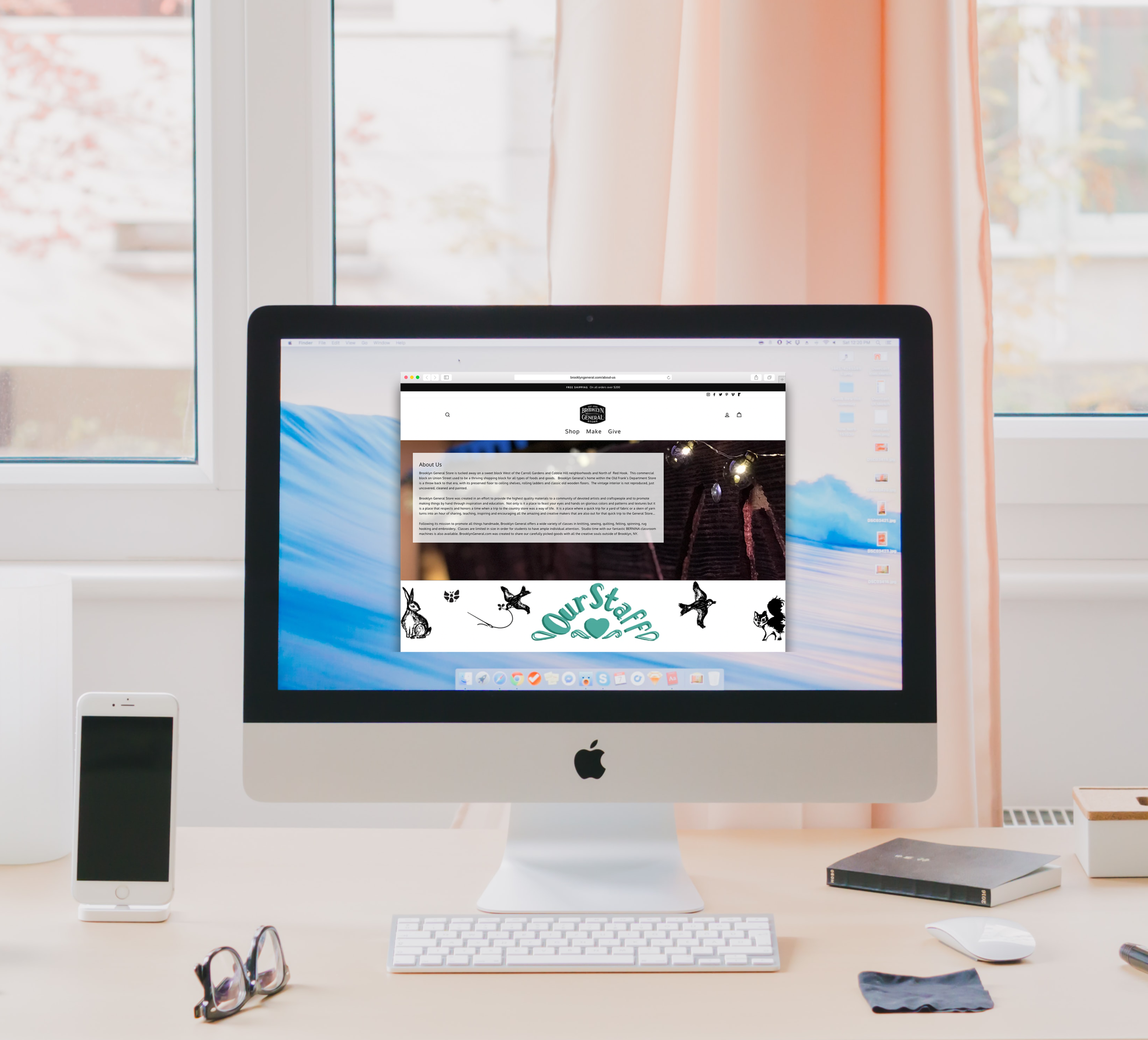 My first assignment was the repeat pattern featured below, printed on kraft butcher paper and designed to be used as packaging for web orders. Many of the motifs were borrowed from a drawing that the owner did herself years ago that was printed on a drawstring bag sold as a product at the store (left). I used some of these motifs again when designing the “about us” page for the website, to lend consistency to the aesthetic and add a friendly, cozy feeling to the page—much like the store itself.