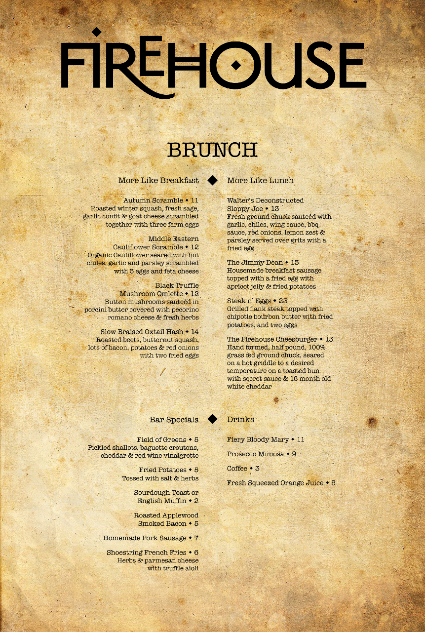 Brooklyn Firehouse is a project inspired by the many delightful gastropubs in Brooklyn. In class I called this “trendy” and a Manhattanite scoffed, because to her “trendy” meant clean lines, a Euro / Bauhaus style, and rooftop dining. In Brooklyn, on the other side of the universe, there is a food movement that has embraced the traditional and authentic, mixing of highbrow and lowbrow menu items, and appreciation of aging structures with exposed brick and original hardware and fixtures. The concept of this imaginary restaurant is that a gastropub style restaurant moved into an abandoned firehouse building, and celebrates the original structure while serving food that caters to bourgeois and basic palettes alike.